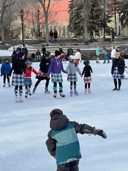 Calgary, Alberta held their kilt skate week three as part of Chinook Blast. It is the most urban of settings with the Calgary skyline and tower as a backdrop. There were highland dancers, live music and other fun. The 4C sunny weather helped too. Was it a chinook? Week three and four saw kilt skates in the kilt skate heartland Ottawa Valley. SSO Director Whitney Brooks launched the first ever GCKS at Rankin Rec Centre in Pembroke. She was assisted by the SSO, local radio, the mayor and pipers. Her idea to fundraise for a charity, Wounded Warriors Canada is one we could all strive to emulate in future.
